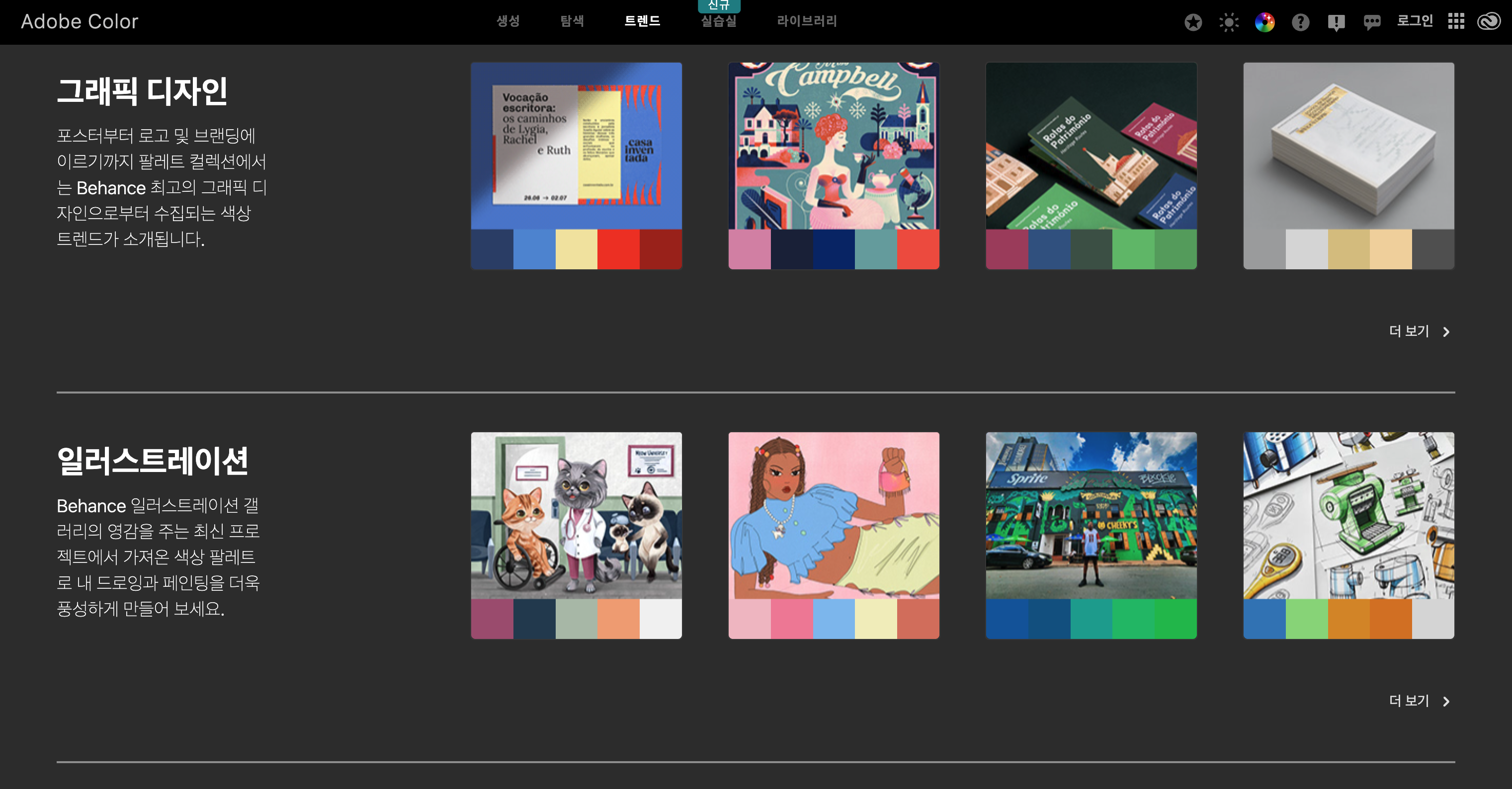 생성, 탐색, 트랜드와 같은 메뉴를 통해서 다양한 컬러를 추출해볼 수 있다. 나는 생성보다는 탐색과 트랜드에서 많은 컬러이 방향성을 찾는다. 처음에 어떤 컬러로 시작할지 고민할때 이 사이트를 쓰면 도움이 될 것이다.