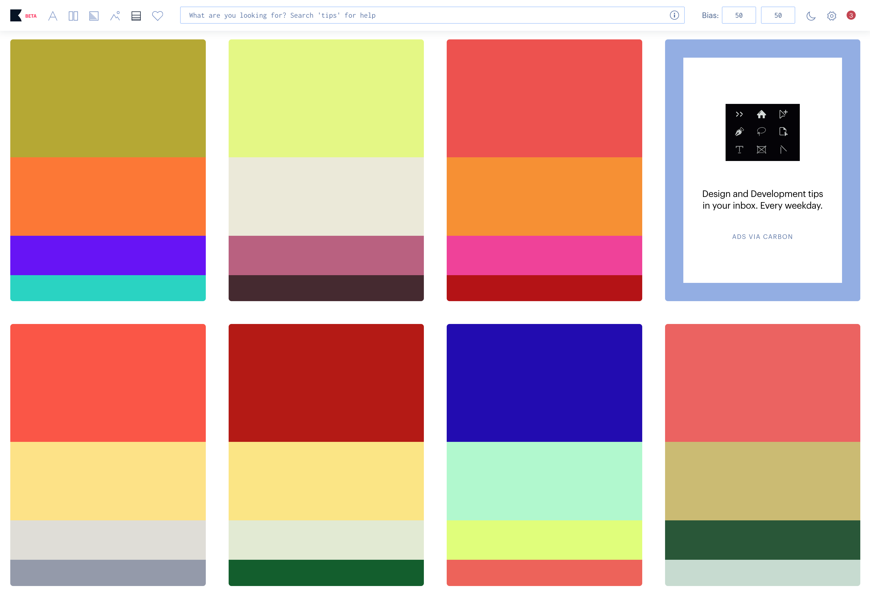 나의 취향인 컬러 50가지를 선택하면 알고리즘에 따라 5가지 디스플레이를 생성해준다. 스크롤을 내릴 때마다 새로운 조합을 생성해주기 때문에 다양한 견해로 색상을 선택할 수 있다.